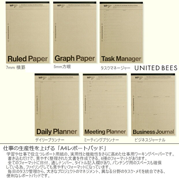 商品名 Graph Paper レポートパッド タスクマネージャー ワーキングペーパー 品番 PAD-WPA4-03 サイズ 縦297mm 横210mm A4サイズ 厚さ5mm パンチガイド・タイトル/インデックス付 仕様 クリーム書籍用紙 50枚入、日本製 メーカー ユナイテッドビーズ株式会社 UNITED BEES さらさら書けて文字が見やすいクリーム色の書籍用紙を使用 やることを書き出して見やすく処理できます。